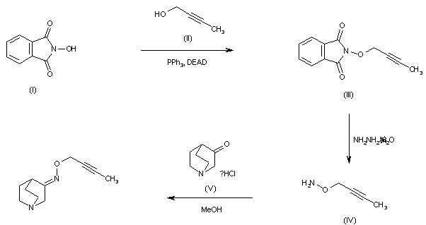N-(2-Butynyloxy)phthalimide (III) was obtained by the Mitsunobu coupling between 2-butyn-1-ol (II) and N-hydroxyphthalimide (I). Subsequent hydrazinolysis of (III) gave the O-alkynyl hydroxylamine (IV). This was finally condensed with quinuclidin-3-one (V) in methanol to furnish the corresponding oxime.