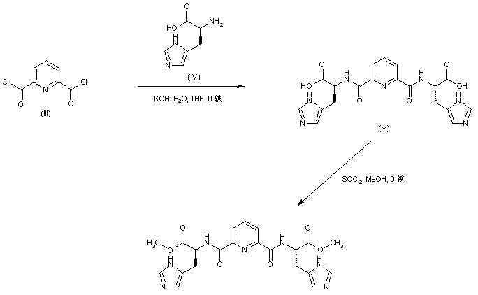 In an alternative process, acid chloride (III) was condensed with histidine (IV) in the presence of KOH in H2O/THF producing de diamide diacid (V), which was then esterified by treatment with SOCl2 in cold methanol.