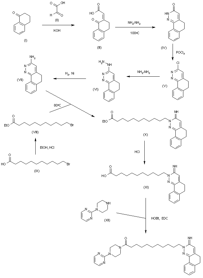 The condensation of 1-tetralone (I) with 2-oxoacetic acid (II) by means of KOH gives 2-(1-oxo-1,2,3,4-tetrahydronaphthalen-2-ylidene)acetic acid (III), which is cyclized with hydrazine in hot butanol to yield the tricyclic pyridazinone (IV). The treatment of (IV) with hot POCl3 gives the chloropyridazine derivative (V), which is treated with hydrazine in boiling water to provide the hydrazino derivative (VI). The hydrogenation of (VI) with H2 over Ni in methanol gives the aminopyridazine derivative (VII), which is condensed with ethyl 11-bromoundecanoate (VIII) (prepared by esterification of the corresponding acid (IX) with Et-OH/HCl) in hot DMF to yield the adduct (X). The hydrolysis of (X) with HCl in hot HOAc affords the corresponding acid (XI), which is finally condensed with 1-(2-pyrimidinyl)piperazine (XII) by means of HOBt and EDC in DMF to provide the target amide.
