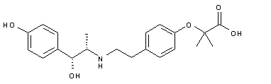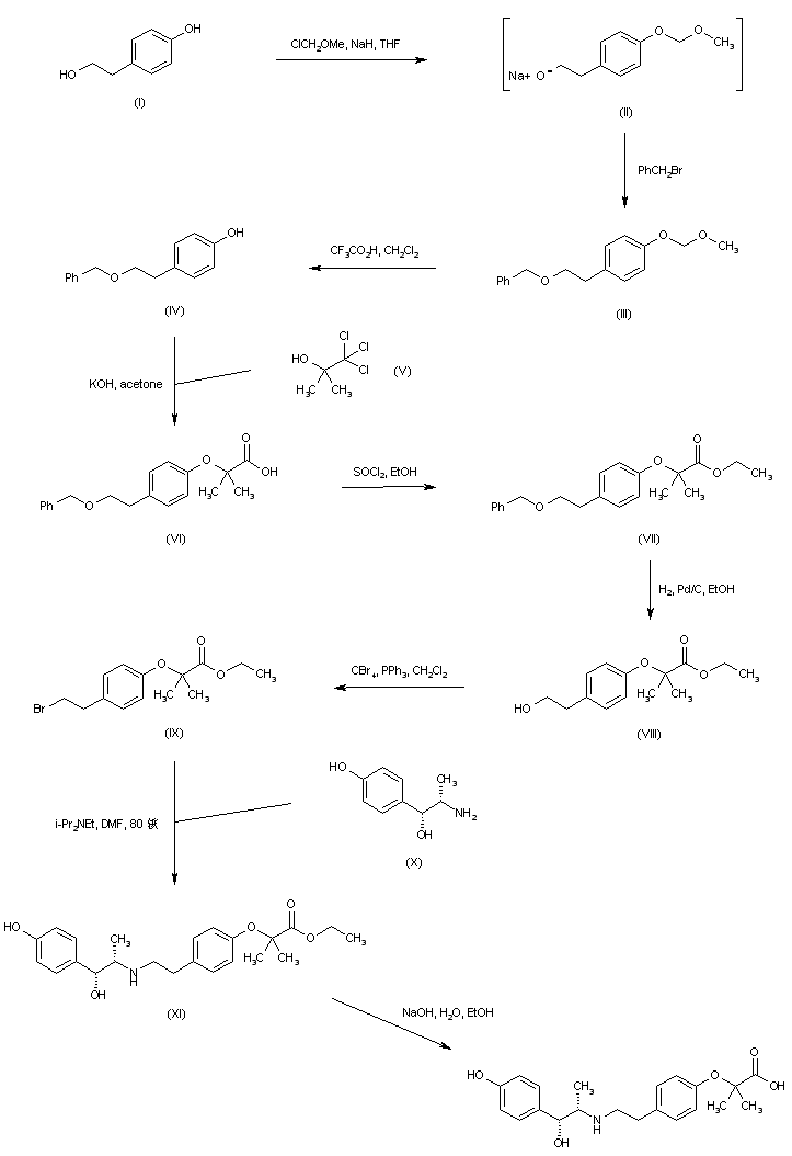 2-(4-Hydroxyphenyl)ethanol (I) was protected at the aliphatic hydroxyl group by the following sequence. Reaction of (I) with methoxymethyl chloride and NaH blocked the phenolic hydroxyl as the methoxymethyl ether (II), which was subsequently treated with benzyl bromide to produce the fully protected compound (III). Further hydrolysis of the methoxymethyl ether using trifluoroacetic acid gave rise to 4-(2-benzyloxyethyl)phenol (IV). Condensation of phenol (IV) with 1,1,1-trichloro-2-methyl-2-propanol (V) under basic conditions generated the 2-(aryloxy)isobutyric acid (VI). After esterification of (VI) with SOCl2 in EtOH to give (VII), its O-benzyl protecting group was removed by catalytic hydrogenation to produce (VIII). Alcohol (VIII) was then converted into alkyl bromide (IX) by using CBr4 and PPh3. Alkylation of (-)-4'-hydroxynorephedrine (X) with bromide (IX) in hot DMF afforded the secondary amine (XI). The ethyl ester group of (XI) was finally hydrolyzed with NaOH to the title carboxylic acid.
