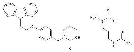 Condensation of 2-(carbazol-9-yl)ethanol (I) with (S)-ethyl 2-ethoxy-3-(4-hydroxyphenyl)propionate (II) under Mitsunobu conditions using tributylphosphine and 1,1'-(azodicarbonyl)dipiperidine gave ether (III). Basic hydrolysis of the ethyl ester group of (III) provided carboxylic acid (IV), which was finally isolated as the corresponding arginine salt.