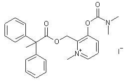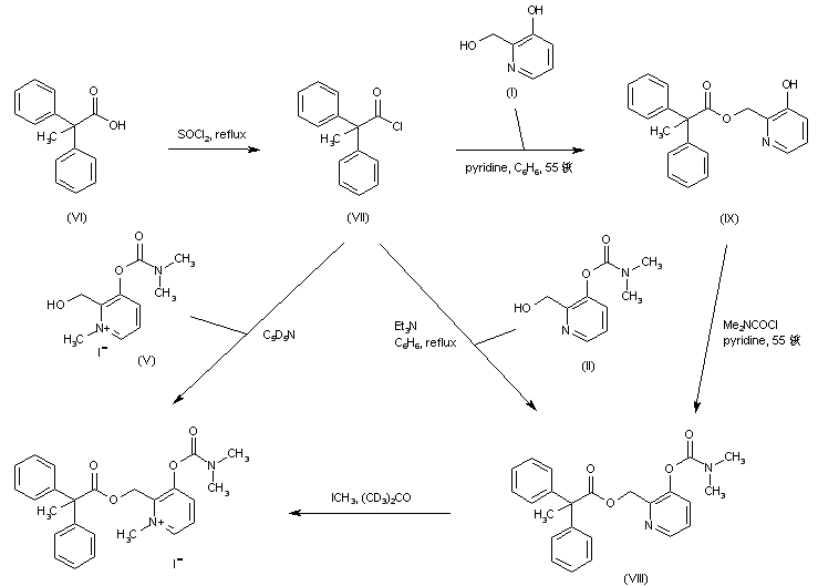 The synthesis of the title compound has been achieved by several related procedures. Acid chloride (VII) was prepared by chlorination of 2,2-diphenylpropionic acid (VI) in refluxing SOCl2. Condensation of (VII) with the (hydroxymethyl)pyridine 3-carbamate (II) provided the corresponding ester (VIII). This compound was also obtained by acylation of 3-hydroxy-2-(hydroxymethyl)pyridine (I) with acid chloride (VII), followed by carbamylation of the resultant hydroxy ester (IX). Quaternization of pyridine (VIII) with iodomethane in deuterated acetone furnished the target N-methylpyridinium salt. The title compound was alternatively prepared by condensation between acid chloride (VII) and the pyridinium alcohol (V) in deuterated pyridine.