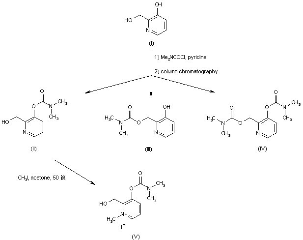 The carbamylation of 3-hydroxy-2-(hydroxymethyl)pyridine (I) with dimethylcarbamyl chloride produced a mixture of the desired 3-carbamate (II) along with the isomeric 2-carbamate (III) and the bis-carbamyl derivative (IV), which were separated by column chromatography. Methylation of (II) with iodomethane in hot acetone afforded the N-methyl pyridinium salt (V).