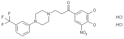 The title compound is prepared by condensation between 2-chloro-1-(3,4-dihydroxy-5-nitrophenyl)ethanone (I) and 1-(3-trifluoromethylphenyl)piperazine (II) in DMF, followed by conversion to the corresponding dihydrochloride salt.