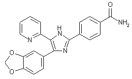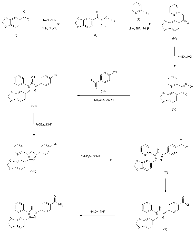 Reaction of piperonyloyl chloride (I) with N,O-dimethylhydroxylamine gives rise to the Weinreb amide (II). This is then condensed with the lithium anion of 2-picoline (III) to produce ketone (IV). Nitrosation of (IV) with NaNO2/HCl leads to keto oxime (V). Subsequent cyclization of (V) with p-formylbenzonitrile (VI) in the presence of ammonium acetate in AcOH affords the N-hydroxy imidazole (VII), which is further reduced to the triaryl imidazole (VIII) by means of triethyl phosphite in DMF. The cyano group of (VIII) is then hydrolyzed under acidic conditions to provide carboxylic acid (IX). After activation of (IX) as the corresponding acid chloride (X), treatment with ammonium hydroxide in THF yields the target carboxamide (1,2).