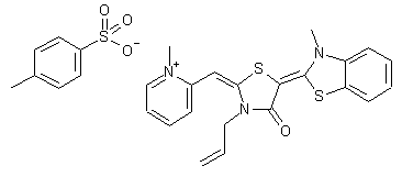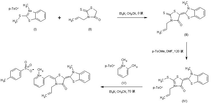 Condensation of the benzothiazolium salt (I) with 3-allylrhodanine (II) in the presence of Et3N afforded the benzothiazolylidene rhodanine (III). S-Methylation of (III) was accomplished by treatment with methyl p-toluenesulfonate at 120 C, yielding (IV). This was finally condensed with 1,2-dimethylpyridinium tosylate (V) in the presence of Et3N to provide the title compound.