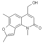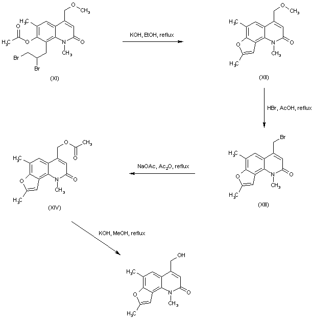 Hydrolysis and cyclization of the dibromo acetate (XI) under basic conditions provides the furoquinoline (XII). Cleavage of the methyl ether group of (XII) using HBr in boiling HOAc gives bromide (XIII). Subsequent bromide displacement in (XIII) by sodium acetate yields acetate ester (XIV), which is finally hydrolyzed to the desired alcohol with methanolic KOH.