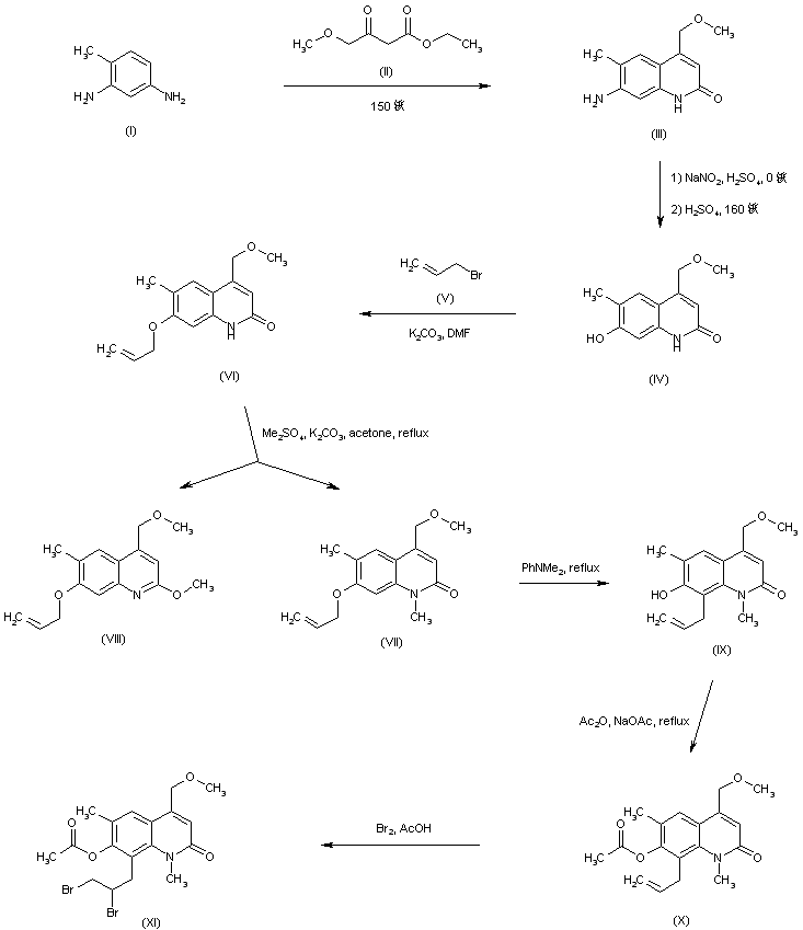 Condensation of 2,4-diaminotoluene (I) with methyl 4-methoxyacetoacetate (II) produces quinolinone (III). Conversion of the 7-aminoquinolinone (III) into the 7-hydroxy analogue (IV) is achieved by diazotization, followed by hydrolysis in hot sulfuric acid. Alkylation of phenol (IV) with allyl bromide (V) gives allyl ether (VI). Subsequent methylation of (VI) by means of dimethyl sulfate leads to a mixture of the desired N-methyl quinoline (VII) along with minor amounts of the O-methyl isomer (VIII), which are separated by column chromatography. Claisen rearrangement of the allyl ether (VII) in refluxing N,N-dimethylaniline affords the 7-hydroxy-8-allyl quinolone (IX), which is further acetylated to (X) by means of acetic anhydride and sodium acetate. Bromination of the allyl group of (X) in HOAc yields the dibromo compound (XI).