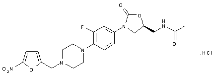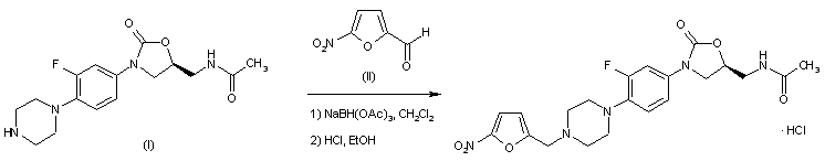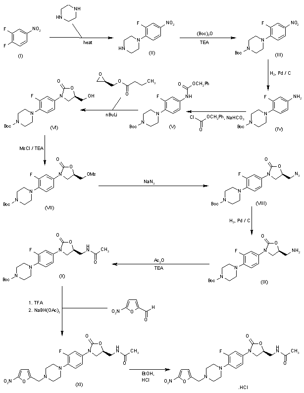 3,4-Difluoronitrobenzene (I) is condensed with piperazine in acetonitrile to give 4-(2-fluoro-4-nitrophenyl)-piperazine (II) as a light yellow compound. Compound (II) is dissolved in dichloromethane and triethylamine, followed by the addition of Boc-anhydride, to provide compound (III). 4-(tert-Butoxycarbonyl)-1-(2-fluoro-4-nitrophenyl)piperazine (III), upon hydrogenation with H2 over Pd/C in methanol at 50 psi, yields 4-(tert-butoxycarbonyl)-1-(2-fluoro-4-aminophenyl)piperazine (IV) as a dark solid. Compound (IV) reacts with benzylchloroformate in dry THF in the presence of solid sodium bicarbonate to afford the desired compound (V). 4-(tert-Butoxycarbonyl)-1-[2-fluoro-4-(benzyloxycarbonylamino)phenyl]piperazine (V), upon treatment with n-BuLi and (R)-glycidyl butyrate at -78 癈, gives the desired (R)-(-)-3-[3-fluoro-4-[4-(tert-butoxycarbonyl)piperazin-1-yl]phenyl]-5-(hydroxymethyl)-2-oxazolidinone (VI). The hydroxymethyl compound (VI) is treated with methanesulfonyl chloride in dichloromethane in the presence of triethylamine to give (R)-(-)-3-[3-fluoro-4-[4-(tert-butoxycarbonyl)piperazin-1-yl]phenyl]-5-(methylsulfonyloxymethyl)-2-oxazolidinone (VII). The sulfonyl derivative (VII) is treated with sodium azide in dimethylformamide to provide the azide (VIII) as a white solid. (R)-(-)-3-[3-Fluoro-4-[4-(tert-butoxycarbonyl)piperazin-1-yl)phenyl]-5-(azidomethyl)-2-oxazolidinone (VIII), upon hydrogenation with H2 over Pd/C at 45 psi, gives (S)-(-)-3-[3-fluoro-4-[4-(tert-butoxycarbonyl)-piperazin-1-yl]phenyl]-5-(aminomethyl)-2-oxazolidinone (IX). The aminomethyl compound (IX), upon treatment with acetic anhydride in dichloromethane in the presence of triethylamine, affords the acetamide derivative (X). The acetamidomethyl-oxazolidinone derivative (X), upon treatment with trifluoroacetic acid, gives (S)-(-)-3-[3-fluoro-4-(1-piperazinyl)phenyl]-5-(acetamidomethyl)-2-oxazolidinone, which, without isolation, is treated with 5-nitro-2-furaldehyde in the presence of sodium triacetoxy borohydride to provide compound (XI). Compound (XI), upon treatment with ethanolic HCl, affords RBx-7644 as a light yellow crystalline solid. |