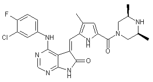 Vilsmeier formylation of ethyl 4-methylpyrrole-2-carboxylate (VIII) affords aldehyde (IX). The ethyl ester group of (IX) is subsequently hydrolyzed under alkaline conditions to provide acid (X). Coupling of (X) with 4-(2-aminoethyl)morpholine (XI) gives amide (XII). Then, condensation between aldehyde (XII) and lactam (VII) in the presence of piperidine leads to adduct (XIII). The 4-chloro group of (XIII) is finally displaced with 3-chloro-4-fluoroaniline (XIV) in hot NMP to provide the title compound