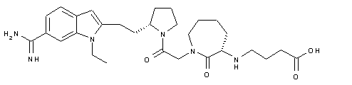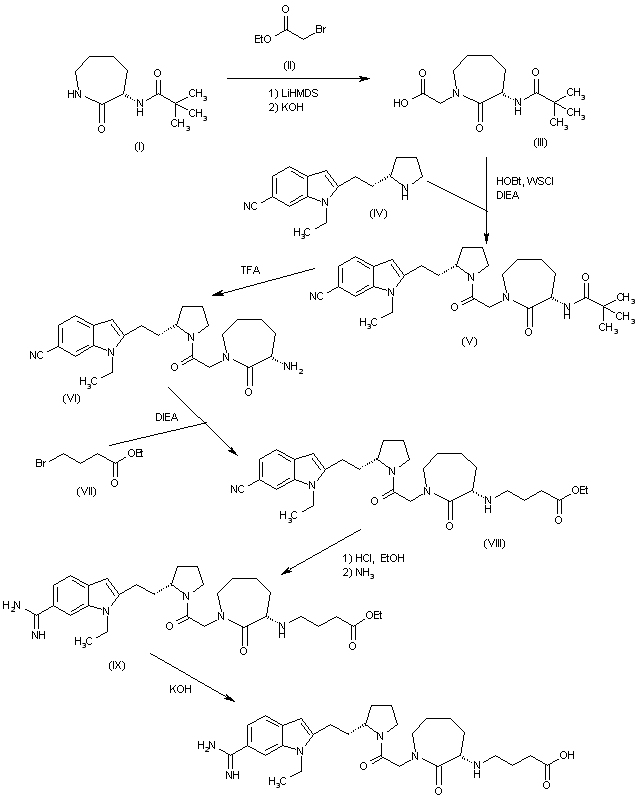 | 合成路线图解说明: The reaction of perhydroazepinone (I) with ethyl 2-bromoacetate (II) by means of LiHMDS in THF, followed by hydrolysis with KOH in methanol/water, gives the perhydroazepinylacetic acid (III), which is condensed with the pyrrolidine derivative (IV) by means of HOBt, WSCl and DIEA in dichloromethane to yield the adduct (V). The cleavage of the carbamate group of (V) with TFA in dichloromethane affords the 3-aminoperhydroazepinone (VI), which is condensed with ethyl 4-bromobutyrate (VII) by means of DIEA in acetonitrile to provide the 4-aminobutyrate derivative (VIII). The reaction of the cyano group of (VIII) with HCl in ethanol, followed by amonolysis with NH3 in the same solvent, gives the carboxamidine derivative (IX), which is hydrolyzed with KOH in ethanol/water to yield the target butyric acid derivative. |