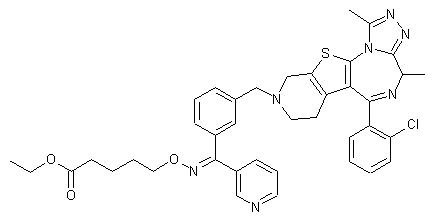 | 合成路线图解说明: Ketone (I) was converted to the corresponding oxime (II) by treatment with hydroxylamine hydrochloride and pyridine. Subsequent alkylation of the oxime (II) with ethyl 5-bromovalerate (III) in the presence of NaH provided (IV). After desilylation of (IV) by means of tetrabutylammonium fluoride, the liberated alcohol (V) was converted to mesylate (VI). The title compound was then obtained by condensation of mesylate (VI) with the pyridothienotriazolodiazepine derivative (VII). |