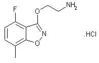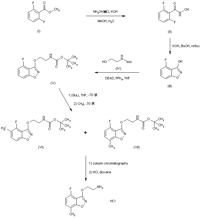 Methyl 2,6-difluorobenzoate (I) was converted to the hydroxamic acid (II) upon treatment with hydroxylamine and KOH. Cyclization of the fluorobenzohydroxamic acid (II) using KOH in boiling butanol produced the 3-hydroxybenzisoxazole (III), which was subjected to Mitsunobu coupling with N-Boc-ethanolamine (IV) to furnish the N-Boc-aminoethyl ether (V). Metalation of (V) with butyllithium at -70 C, followed by quenching with iodomethane gave rise to two regioisomeric methylbenzisoxazoles (VI) and (VII), which were separated by column chromatography. The target 7-methyl benzisoxazole (VII) was then deprotected under acidic conditions to yield the title aminoethoxy derivative.