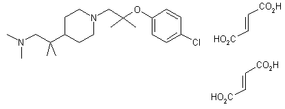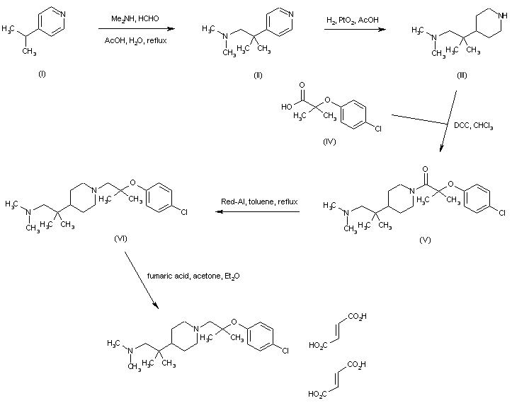 Mannich reaction between 4-isopropylpyridine (I), formaldehyde, and dimethylamine, furnished the pyridyl ethylamine (II). Subsequent hydrogenation of the pyridine ring of (III) in the presence of PtO2 gave rise to piperidine (III). This was coupled with 2-(p-chlorophenoxy)-2-methylpropionic acid (IV) to provide amide (V). Then, amide (V) reduction by means of sodium bis(methoxyethoxy)aluminum hydride produced diamine (VI). This was finally converted to the title maleate salt upon treatment with maleic acid in acetone-ether.