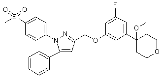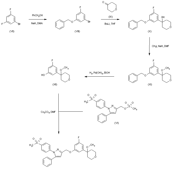 Displacement of 3,5-difluorobromobenzene (VII) with the sodium alkoxide of benzyl alcohol yields the benzyl ether (VIII). Metalation of (VIII) with butyllithium, followed by addition to tetrahydropyran-4-one (IX) furnishes the carbinol adduct (X). This is converted to the methyl ether (XI) by alkylation with iodomethane in the presence of NaH. Then, hydrogenolysis of the O-benzyl group of (XI) over Pd(OH)2 provides phenol (XII). Finally, condensation between phenol (XII) and mesylate (VI) gives rise to the title compound