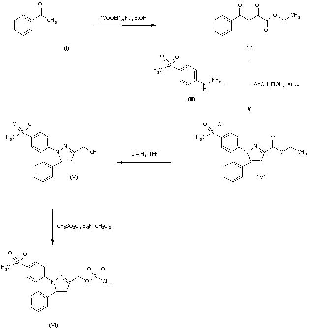 Claisen condensation of acetophenone (I) with diethyl oxalate affords the dioxo ester (II). This is condensed with 4-(methylsulfonyl)phenylhydrazine (III) to form the diaryl pyrazole (IV). Ester group reduction in (IV) by means of LiAlH4 provides alcohol (V), which is converted to the corresponding mesylate (VI) upon treatment with methanesulfonyl chloride and Et3N