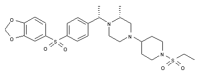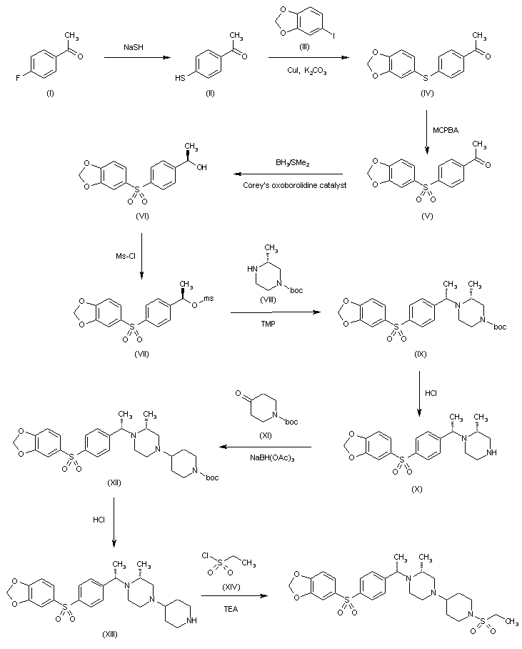 The reaction of 4-fluoroacetophenone (I) with sodium hydrogensulfide in hot DMF gives 4-sulfanylacetophenone (II), which is condensed with 5-iodo-1,3-benzodioxole (III) by means of CuI and K2CO3 in hot DMF to yield the thioether (IV). The oxidation of (IV) with MCPBA in dichloroethane affords the sulfone (V), which is enantioselectively reduced by means of BH3/SMe2 and Corey's oxoborolidine catalyst in THF to provide the chiral (R)-alcohol (VI). The reaction of (VI) with Ms-Cl in dichloromethane gives the mesylate (VII), which is condensed with the monoprotected 2(R)-methylpiperazine (VIII) by means of tetramethylpiperidine (TMP) in refluxing acetonitrile to yield the expected benzylic (S)-methyl compound (IX). The elimination of the Boc protecting group of (IX) with refluxing 6N HCl affords the piperazine derivative (X), which is reductocondensed with 1-(Boc)piperidin-4-one (XI) by means of NaBH(OAc)3 to provide adduct (XII). Elimination of the Boc protecting group of (XII) as before gives the piperidine derivative (XIII), which is finally sulfonated with ethylsulfonyl chloride and TEA to provide the target ethylsufonyl piperidine.