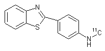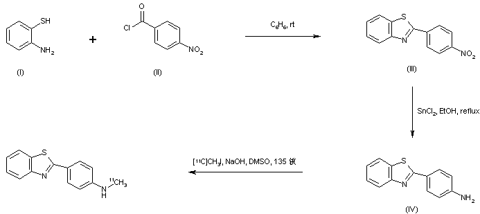 Condensation of 2-aminothiophenol (I) with 4-nitrobenzoyl chloride (II) produces the benzothiazole (III). Reduction of the nitro group of (III) by means of SnCl2 in refluxing EtOH yields aniline (IV). Then, alkylation of (IV) with 11C-labeled iodomethane gives rise to the target 11C-methylated aniline.