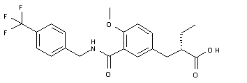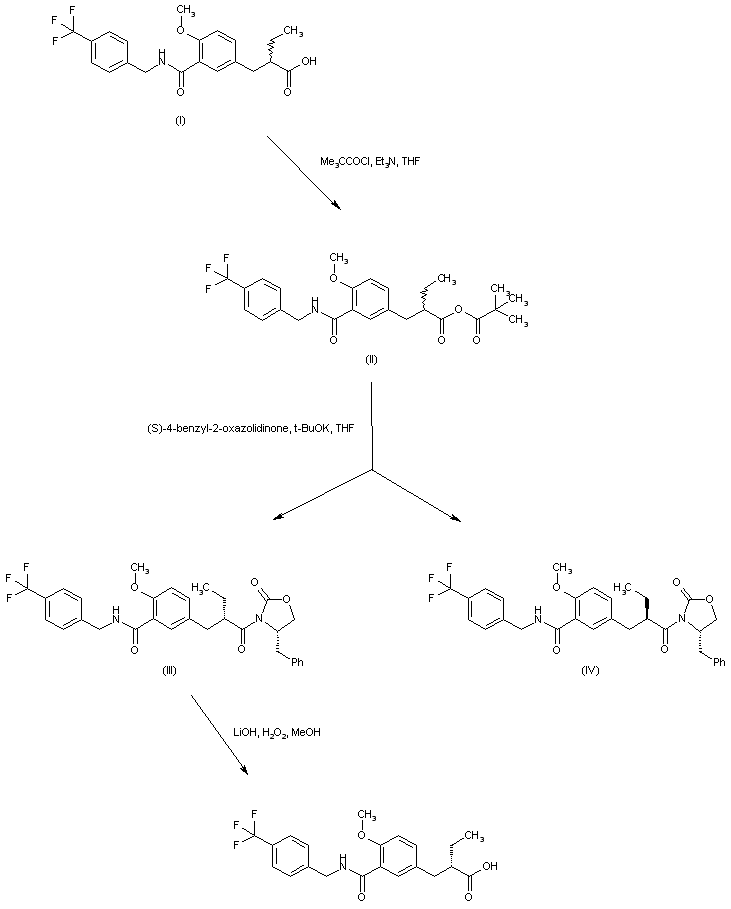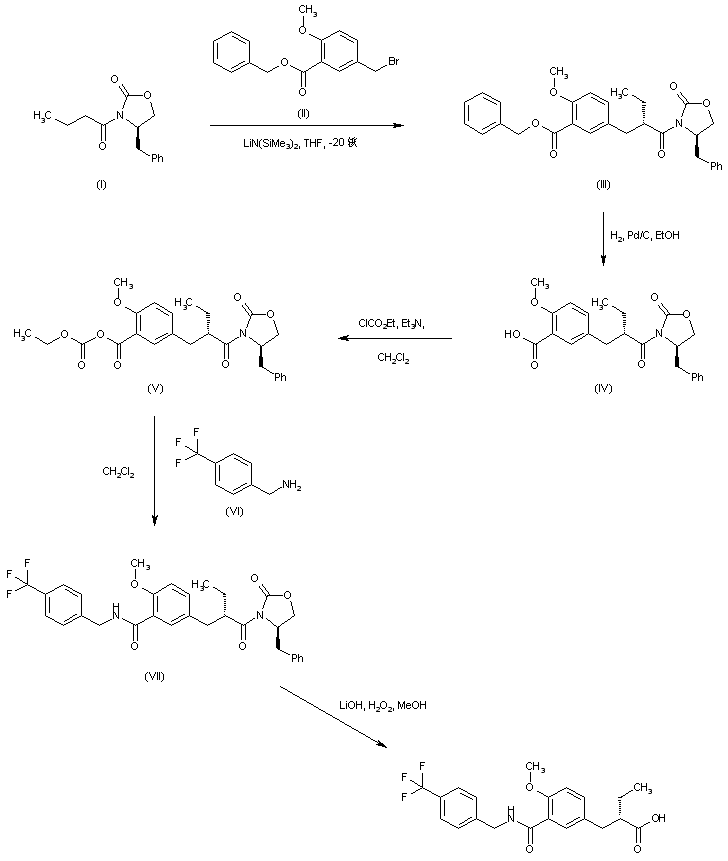 In an enantioselective synthesis of the (S)-enantiomer, asymmetric alkylation of the chiral N-butyryl oxazolidinone (I) with benzyl 5-bromomethyl-2-methoxybenzoate (II) in the presence of lithium hexamethyldisilazide leads to isomer (III) in high diastereomeric excess. Subsequent benzyl ester hydrogenolysis in (III) employing Pd/C affords carboxylic acid (IV), which is further converted to the mixed anhydride (V) with ethyl chloroformate and triethylamine. Coupling of anhydride (V) with 4-trifluoromethylbenzylamine (VI) furnishes the corresponding amide (VII). The chiral auxiliary is then removed from (VII) by hydrolysis with lithium peroxide to yield the target (S)-enantiomer.