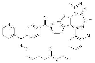 Ketone (I) was converted to the corresponding oxime (II) by treatment with hydroxylamine hydrochloride and pyridine. Subsequent alkylation of the oxime (II) with ethyl 5-bromovalerate (III) in the presence of NaH provided (IV). After desilylation of (IV) by means of tetrabutylammonium fluoride, the liberated alcohol (V) was converted to mesylate (VI). The title compound was then obtained by condensation of mesylate (VI) with the pyridothienotriazolodiazepine derivative (VII).