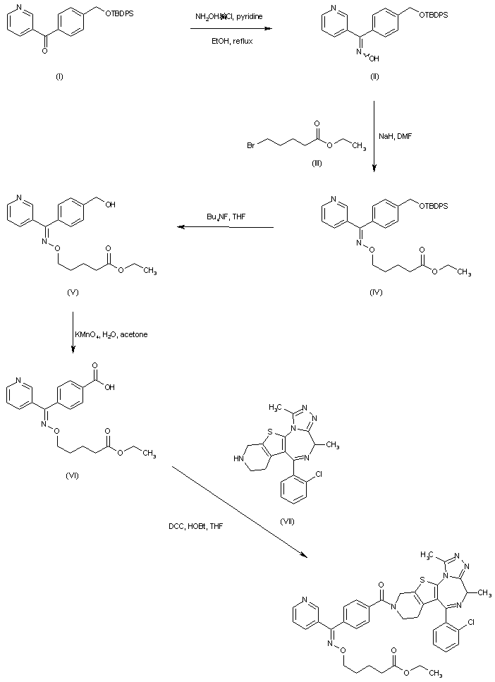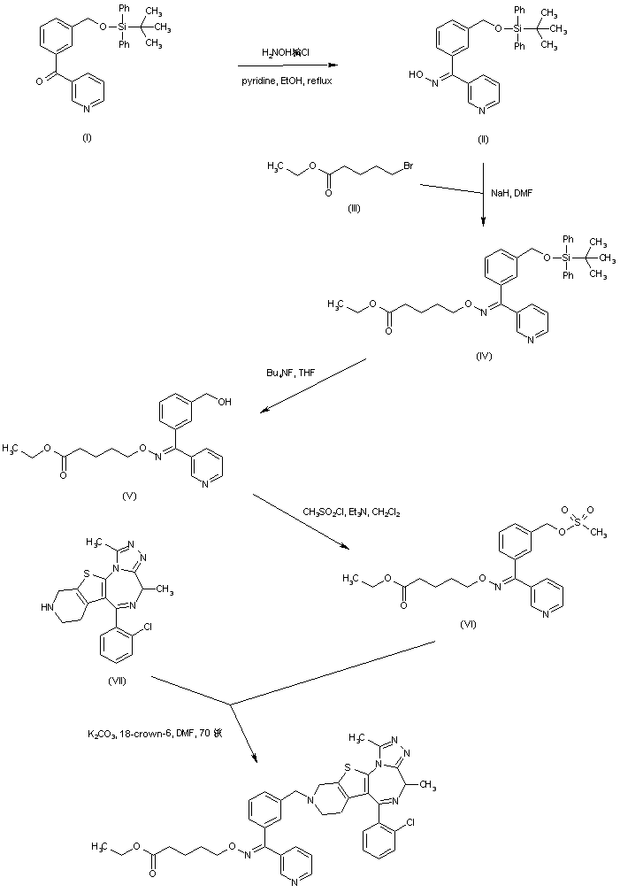 | 合成路线图解说明: Ketone (I) was converted to the corresponding oxime (II) by treatment with hydroxylamine hydrochloride and pyridine. Subsequent alkylation of the oxime (II) with ethyl 5-bromovalerate (III) in the presence of NaH provided (IV). After desilylation of (IV) by means of tetrabutylammonium fluoride, the liberated alcohol (V) was converted to mesylate (VI). The title compound was then obtained by condensation of mesylate (VI) with the pyridothienotriazolodiazepine derivative (VII). |