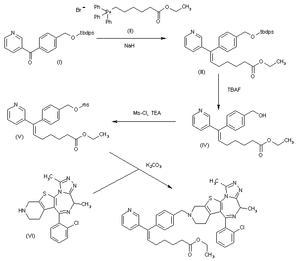 | 合成路线图解说明: The Wittig condensation of 1-[4-(tert-butyldiphenylsilyloxymethyl)phenyl]-1-(3-pyridyl)methanone (I) with phosphonium bromide (II) by means of NaH in tert-butanol gives the heptenoic ester (III), which is desilylated with TBAF in THF to yield 7-[4-(hydroxymethyl)phenyl]-7-(3-pyridyl)-6-heptenoic acid ethyl ester (IV). The reaction of (IV) with Ms-Cl and TEA affords the corresponding mesylate (V), which is finally condensed with the triazolodiazepine (VI) by means of K2CO3 and 18-crown-6 in DMF. |