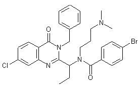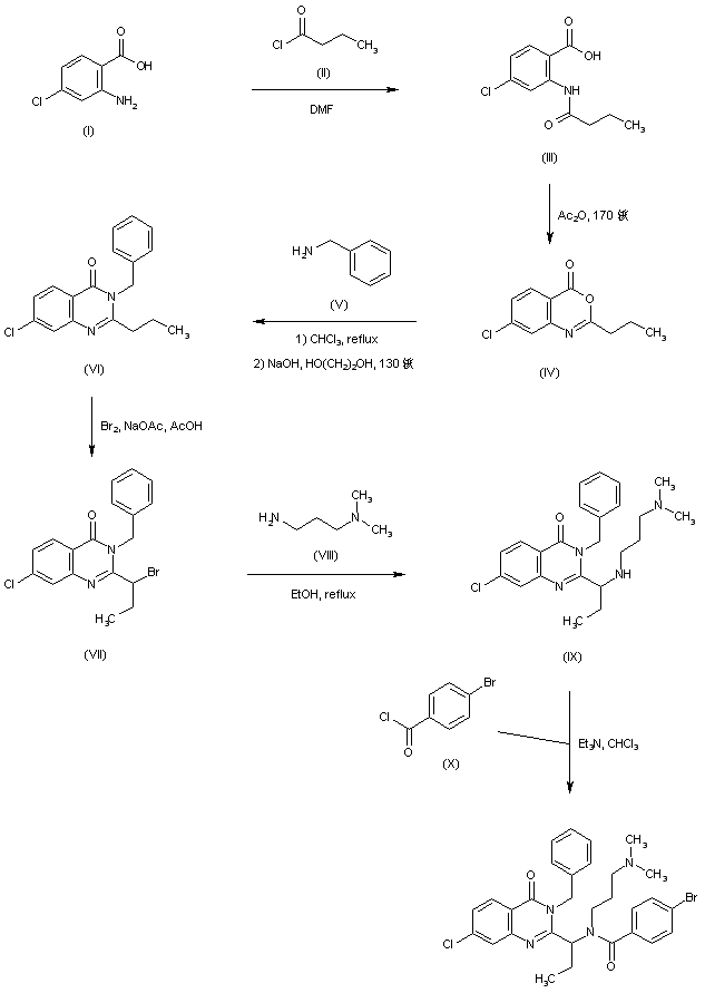 4-Chloroanthranilic acid (I) is acylated by butyryl chloride (II) in DMF to produce amide (III). This is then cyclized to the benzoxazinone (IV) upon heating with acetic anhydride. Condensation of (IV) with benzylamine (V) in refluxing chloroform, followed by treatment with NaOH in hot ethyleneglycol, gives rise to the quinazolinone (VI). Subsequent benzylic bromination of (VI) at the propyl side chain produces (VII). The bromide group of (VII) is then displaced with N,N-dimethyl-1,3-propanediamine (VIII) to furnish (IX). Finally, amine (IX) is acylated by 4-bromobenzoyl chloride (X) to afford the corresponding benzamide.