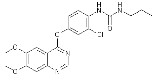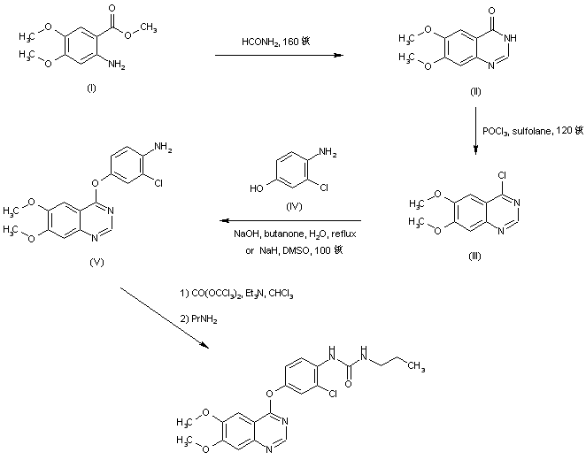 6,7-Dimethoxy-4-quinazolone (II) was prepared by condensation of methyl 4,5-dimethoxyanthranilate (I) with formamide at 160 C. Chlorination of (II) by means of phosphorus oxychloride provided the 4-chloro quinazoline (III). Substitution of the 4-chloro group of (III) by the sodium salt of 4-amino-3-chlorophenol (IV) gave rise to the quinazolinyl ether (V). Finally, condensation of amine (V) with triphosgene, followed by addition of n-propylamine furnished the title urea derivative.