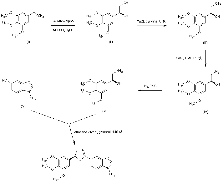 Enantioselective dihydroxylation of styrene (I) using AD-mix-alpha gave the (S)-diol (II). Tosylation of the primary hydroxyl group of (II), followed by nucleophilic displacement of the tosylate (III) with NaN3, provided azido alcohol (IV). The azido group of (IV) was then reduced to the corresponding amine (V) by catalytic hydrogenation in the presence of Pd/C. Finally, condensation of the chiral amino alcohol (V) with 1-methyl-5-cyanoindole (VI) in a hot mixture of ethylene glycol and glycerol yielded the target diaryl oxazolidine.