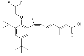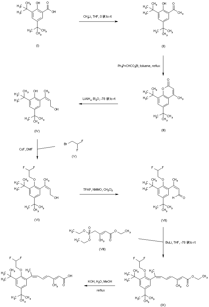Addition of methyllithium to 3,5-di-tert-butylsalicylic acid (I) affords ketone (II). Wittig condensation of the ortho-hydroxyacetophenone (II) with (carbethoxymethylene)triphenylphosphorane leads to the coumarin derivative (III). Subsequent reductive opening of the lactone ring of (III) by means of LiAlH4 provides diol (IV). The phenolic hydroxyl of (IV) is then alkylated by 1,1-difluoro-2-bromoethane (V) in the presence of CsF to furnish the difluoroethyl ether (VI). Oxidation of the allylic alcohol function of (VI) to aldehyde (VII) is accomplished by treatment with tetrapropylammonium perruthenate and N-methylmorpholine-N-oxide. Wadsworth-Emmons condensation of the unsaturated aldehyde (VII) with phosphonate (VIII) then provides the triene adduct (IX). The ethyl ester group of (IX) is finally hydrolyzed under alkaline conditions to the desired carboxylic acid.