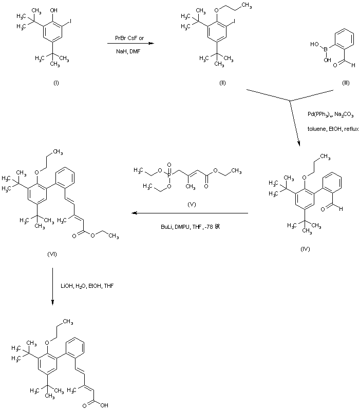 Alkylation of 2,4-di-tert-butyl-6-iodophenol (I) with bromopropane by means of NaH (1) or CsF (2) provides the corresponding propyl ether (II). Subsequent Suzuki coupling of aryl iodide (II) with 2-formylbenzeneboronic acid (III) leads to the biphenyl aldehyde (IV). This is then condensed with phosphonate (V) producing the dienoate ester (VI). Finally, the ethyl ester group of (VI) is hydrolyzed with LiOH to the target carboxylic acid (1,2).