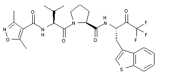 N-Boc-Benzothienylalanine (I) was converted to oxazolidinone (II) by treatment with paraformaldehyde in the presence of p-toluenesulfonic acid. Reaction of oxazolidinone (II) with trimethyl(trifluoromethyl)silane produced the corresponding trifluoromethyl ketone, which was subsequently reduced to alcohol (III) by using NaBH4 in MeOH (1). Cleavage of the N-Boc group of (III) under acidic conditions afforded amine (IV). This was then coupled with N-Boc-L-valyl-L-proline (V) using EDC to furnish the N-Boc-tripeptidyl alcohol (VI). Deprotection of (VI) by means of HCl in dioxane gave amine (VII), which was acylated with 3,5-dimethylisoxazole-4-carboxylic acid (VIII) to yield amide (IX). Finally, oxidation of the alcohol function of (IX) employing the Dess-Martin periodinane reagent provided the target trifluoromethyl ketone