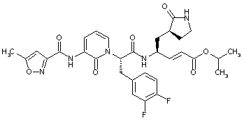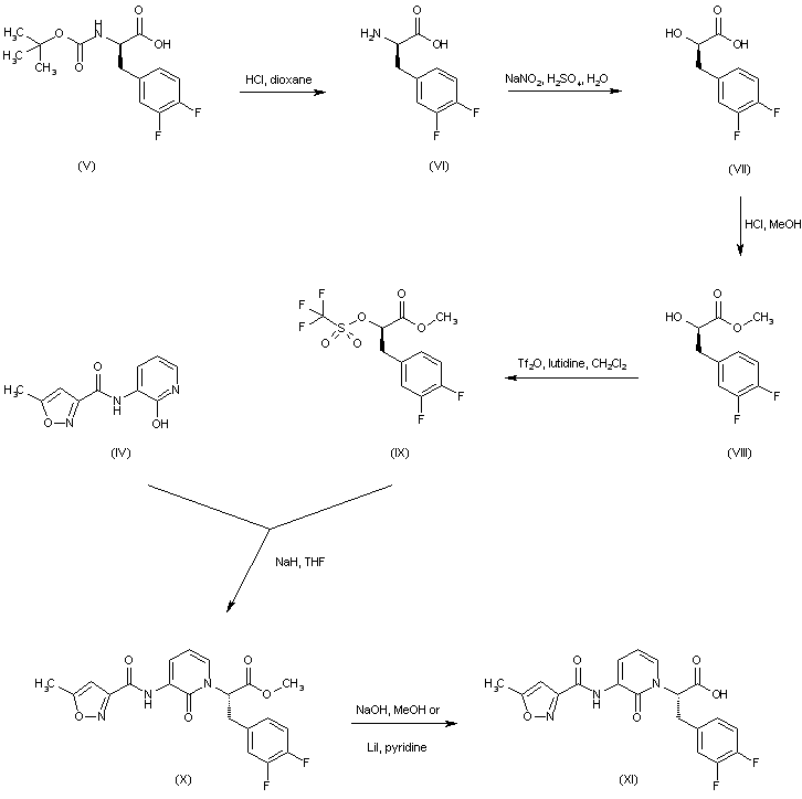 Deprotection of N-Boc-D-3,4-difluorophenylalanine (V) by means of HCl in dioxane yields aminoacid (VI). Subsequent diazotization of (VI) with NaNO2/H2SO4 leads to hydroxyacid (VII). After esterification of (VII) with methanolic HCl, the hydroxyester (VIII) is converted into triflate (IX) upon treatment with trifluoromethanesulfonic anhydride and 2,6-lutidine. Condensation of hydroxypyridine (IV) with triflate (IX) in the presence of NaH gives rise to the N-alkylated pyridone (X). The methyl ester group of (X) is then hydrolyzed to the corresponding carboxylic acid (XI) by means of either NaOH or LiI in pyridine. (1,2)