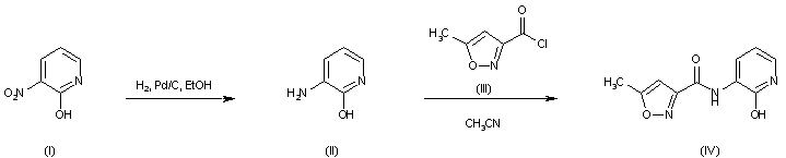 Catalytic hydrogenation of 2-hydroxy-3-nitropyridine (I) in the presence of Pd/C affords 3-amino-2-hydroxypyridine (II). This is then acylated by 5-methylisoxazole-3-carbonyl chloride (III) to furnish the corresponding amide (IV). (1)