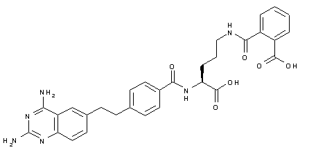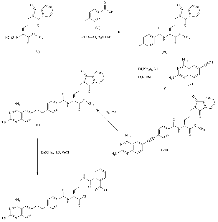 Condensation between phthaloyl ornithine methyl ester (V) and 4-iodobenzoic acid (VI), via activation with isobutyl chloroformate, furnishes the iodobenzamide (VII). Subsequent coupling of iodo amide (VII) with the ethynyl quinazoline (IV) employing Pd(PPh3)4 and CuI leads to the disubstituted acetylene (VIII). Catalytic hydrogenation of the triple bond in the presence of Pd/C affords (IX). Then, basic hydrolysis of phthalimido ester (IX) by means of Ba(OH)2 produces the target compound.