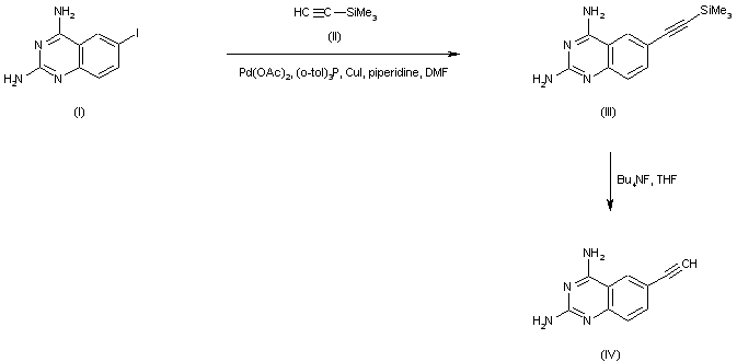 Palladium-catalyzed coupling of 2,4-diamino-6-iodoquinazoline (I) with trimethylsilyl acetylene (II) affords the silylethynyl quinazoline (III). Subsequent treatment of (III) with tetrabutylammonium fluoride leads to the desilylated acetylene compound (IV).