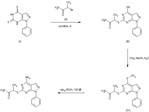 Monoalkylation of 1-phenylpyrazolo[3,4-d]pyrimidine-4,6-dithione (I) with 2-bromopropionamide (II) produced selectively the 6-substituted compound (III). Subsequent methylation of the free 4-mercapto group yielded the 4-methylsulfanyl derivative (IV). Finally, displacement of the methylsulfanyl group of (IV) with ethanolic ammonia in a sealed tube at 100 C furnished the title amino compound.