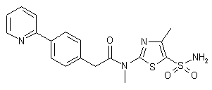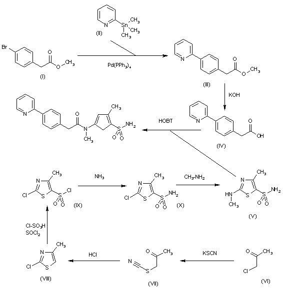 The condensation of 2-(4-bromophenyl)acetic acid methyl ester (I) with 2-(trimethylstannyl)pyridine (II) by means of Pd(PPh3)4 in refluxing toluene gives 2-[4-(2-pyridyl)phenyl]acetic acid methyl ester (III), which is hydrolyzed with KOH in THF/water to yield the corresponding acetic acid (IV). Finally, this compound is condensed with 4-methyl-2-(methylamino)thiazole-5-sulfonamide (V) by means of HOBt and DEC in DMF to afford the target phenylacetamide. The intermediate 4-methyl-2-(methylamino)thiazole-5-sulfonamide (V) is obtained as follows: the reaction of 1-chloroacetone (VI) with KSCN in water gives the corresponding thiocyanato (VII), which is cyclized by means of dry HCl in dichloromethane to yield 2-chloro-4-methylthiazole (VIII). The reaction of (VIII) with Cl-SO3H and SOCl2 affords the sulfonyl chloride (IX), which is treated with ammonia in THF/water to provide 2-chloro-4-methylthiazole-5-sulfonamide (X). Finally, this compound is treated with methylamine in acetonitrile to obtain the target sulfonamide intermediate (V).