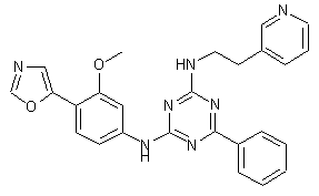 Addition of phenylmagnesium bromide (VII) to cyanuric chloride (VI) provided 2,4-dichloro-6-phenyltriazine (VIII). This was subsequently condensed with aniline (V) to afford the aminotriazine (IX). Finally, displacement of the remaining chlorine of (IX) with 2-(3-pyridyl)ethylamine (X) furnished the target diaminotriazine derivative.