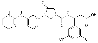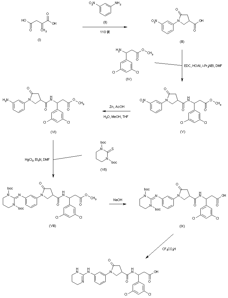 Cyclization of itaconic acid (I) with 3-nitroaniline (II) at 100 C gives rise to 1-(3-nitrophenyl)-5-oxopyrrolidine-3-carboxylic acid (III). Subsequent condensation of acid (III) with methyl 3-amino-3-(3,5-dichlorophenyl)propanoate (IV) in the presence of EDC and HOAt yields amide (V). Reduction of the nitro group of (V) to the corresponding amine (VI) is effected by means of Zn and HOAc. Amine (VI) is then condensed with the cyclic thiourea (VII) employing HgCl2 to furnish the di-Boc-protected guanidine (VIII). Saponification of the methyl ester function of (VIII) then gives acid (IX). The N-Boc groups of (IX) are finally removed by treatment with trifluoroacetic acid to furnish the title compound.