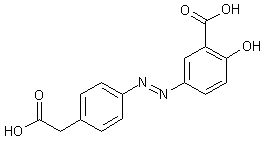 The diazotization of 2-(4-aminophenyl)acetic acid (I) by means of NaNO2 and HCl gives the diazonium salt (II), which is then condensed with 2-hydroxybenzoic acid (III) to provide the target azocompound.