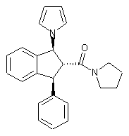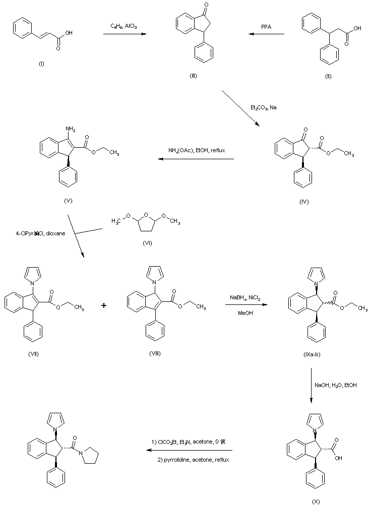 3-Phenylindan-1-one (III) is prepared by either condensation between cinnamic acid (I) and benzene in the presence of AlCl3 or by Friedel-Crafts cyclization of 3,3-diphenylpropionic acid (II) in hot polyphosphoric acid. Claisen condensation of indanone (III) with diethyl carbonate affords keto ester (IV), which is further converted to enamino ester (V) upon treatment with ammonium acetate in boiling EtOH. Clauson-Kaas condensation of aminoindene (V) with 2,5-dimethoxytetrahydrofuran (VI) provides a mixture of isomeric pyrrolyl indenes (VII) and (VIII). Subsequent reduction of this mixture with NaBH4/NiCl2 affords the epimeric mixture of indanes (IX). Alkaline hydrolysis of esters (IX) proceeds with epimerization at C-2 to furnish the trans-trans acid (X). After activation of acid (X) as the corresponding mixed anhydride with ethyl chloroformate, coupling with pyrrolidine yields the target amide.