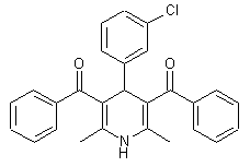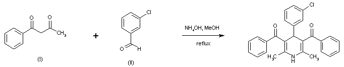 The title dihydropyridine is prepared by condensation of benzoylacetone (I) with 3-chlorobenzaldehyde (II) in the presence of aqueous ammonia, following a variation of the Hantzsch reaction.