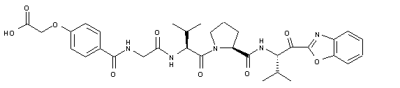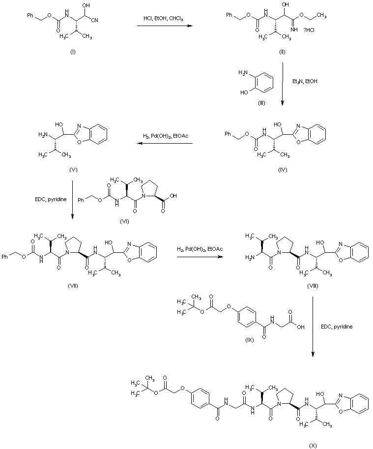 N-Cbz-L-Valinal cyanohydrin (I) is converted into imidate (II) and then condensed with 2-aminophenol (III) to afford benzoxazole (IV). Removal of the N-Cbz group of (IV) with H2 and Pd/C provides amine (V), which is then coupled to N-Cbz-valyl proline (VI), yielding the dipeptide amide (VII). After hydrogenolysis of the N-Cbz protecting group of (VII), the free amine (VIII) is coupled to the acid fragment (IX) by means of EDC/pyridine to furnish (X).