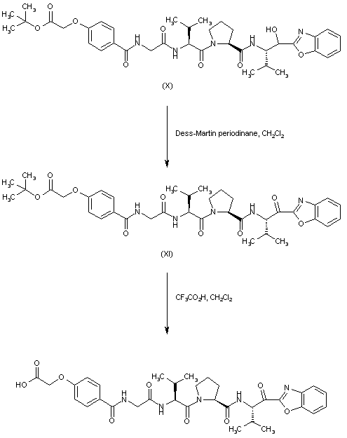 Oxidation of the secondary alcohol of (X) employing the Dess-Martin periodinane reagent leads to ketone (XI). The t-butyl ester group of (XI) is finally cleaved in the presence of trifluoroacetic acid to generate the title compound.