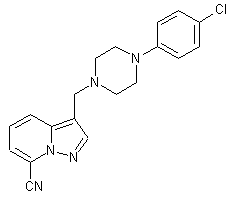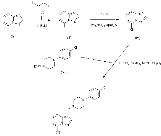 Lithiation of 8-azaindole (I) with n-BuLi, followed by treatment with 1,2-diiodoethane (II) affords 7-iodopyrazolopyridine (III), which is then treated with CuCN, Pd2(dba)3 and diphenylphosphinoferrocene (dppf) in refluxing dioxane to provide pyrazolo[1,5-a]pyridine-7-carbonitrile (IV). Finally, Mannich condensation of (IV) with N-(4-chlorophenyl)piperazine (V) and formaldehyde gives rise to the title piperazinomethyl derivative.