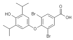 Methylation of 2,6-diisopropylphenol (I) with iodomethane and K2CO3 provides ether (II). Subsequent treatment with iodine and nitric acid gives rise to the diaryl iodonium compound (III), isolated as the corresponding tetrafluoroborate salt. 3,5-Dibromo-4-hydroxybenzoic acid (IV) is esterified with methanol and thionyl chloride to produce (V). Copper-promoted coupling between hydroxybenzoate (V) and the diaryl iodonium salt (III) leads to diaryl ether (VI). Finally, simultaneous cleavage of the methyl ether and ester groups of (VI) is achieved by means of boron tribromide in cold CH2Cl2