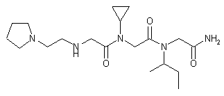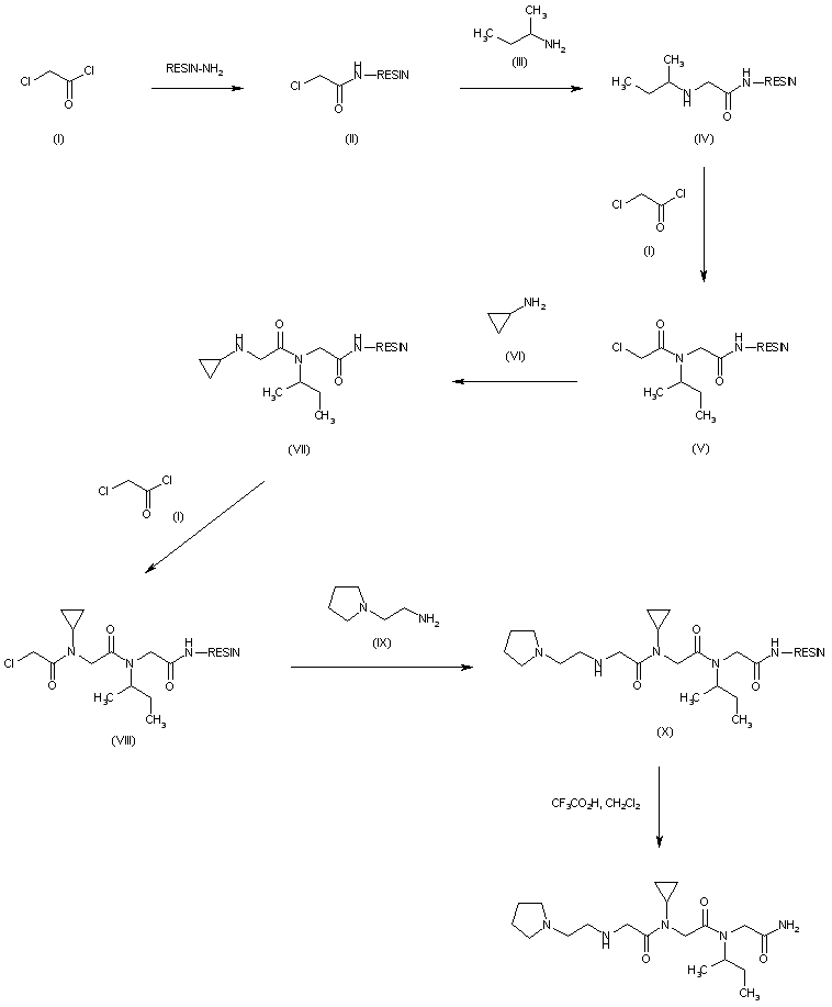 The title compound is prepared by solid phase synthesis employing a Rink amide resin. Acylation of the resin with chloroacetyl chloride (I) affords the chloroacetyl resin (II). Subsequent chloride displacement with s-butylamine (III) provides the aminoacid-bound resin (IV). A new acylation of (IV) with chloroacetyl chloride (I) yields the chloroacetamide (V), which is then displaced by cyclopropylamine (VI), yielding the dipeptide derivative (VII). Then, a further coupling of (VII) with acid chloride (I), followed by displacement of the resultant chloroacetamide resin (VIII) with N-(2-aminoethyl)pyrrolidine (IX) gives rise to the tripeptide resin (X). Finally, cleavage of the dipeptide amide from the solid support is accomplished by treatment with trifluoroacetic acid in CH2Cl2