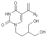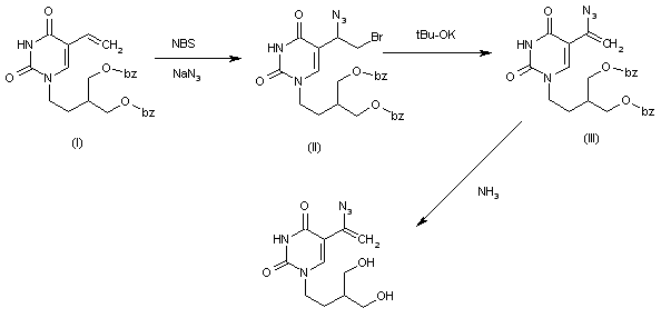 The reaction of the 5-vinyluracil derivative (I) with NBS and NaN3 in dimethoxyethane gives the 1-azido-2-bromoethyluracil derivative (II), which is treated with potassium tert-butoxide in THF to yield the 1-azidovinyluracil compound (III). Finally, this compound is debenzoylated with ammonia in methanol to afford the target dihydroxylated uracil derivative.