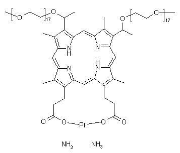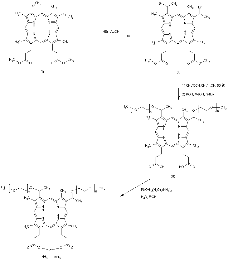 Protoporphyrin dimethyl ester (I) is treated with HBr in HOAc to produce dibromide (II). Displacement of the bromide groups of (II) by poly(ethyleneglycol)-750-mono-methyl ether, followed by alkaline hydrolysis of the concomitantly transesterified ester groups, furnishes the porphyrin di-ether (III). This is finally complexed with diammine(diaqua)platinum(II) hydroxide to yield the title compound.